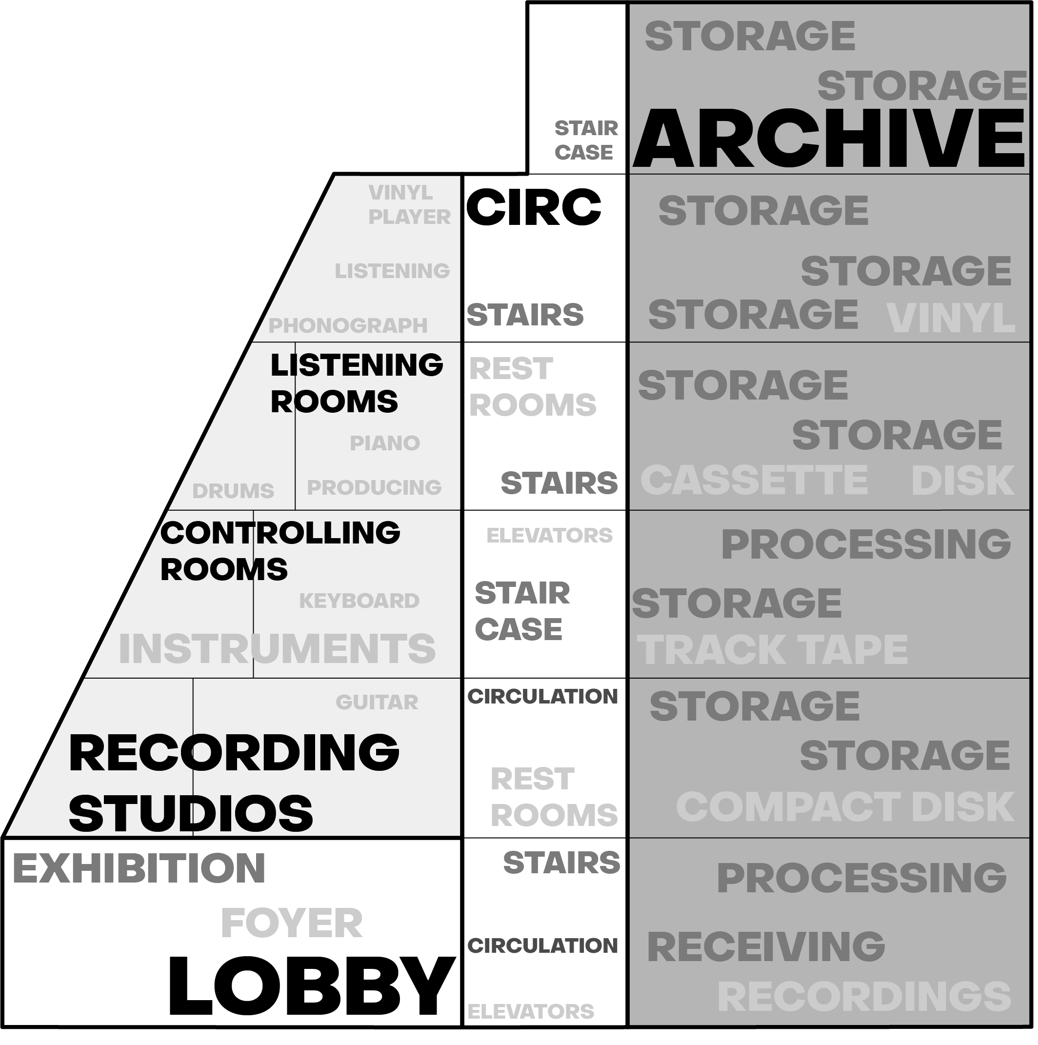 Located in the dense urban fabric of Manhattan, this project reimagines the archive not as a closed vault, but as an accessible, vertical soundscape. The design addresses the duality of preservation and experience: storing delicate music recordings while making them accessible to the public.