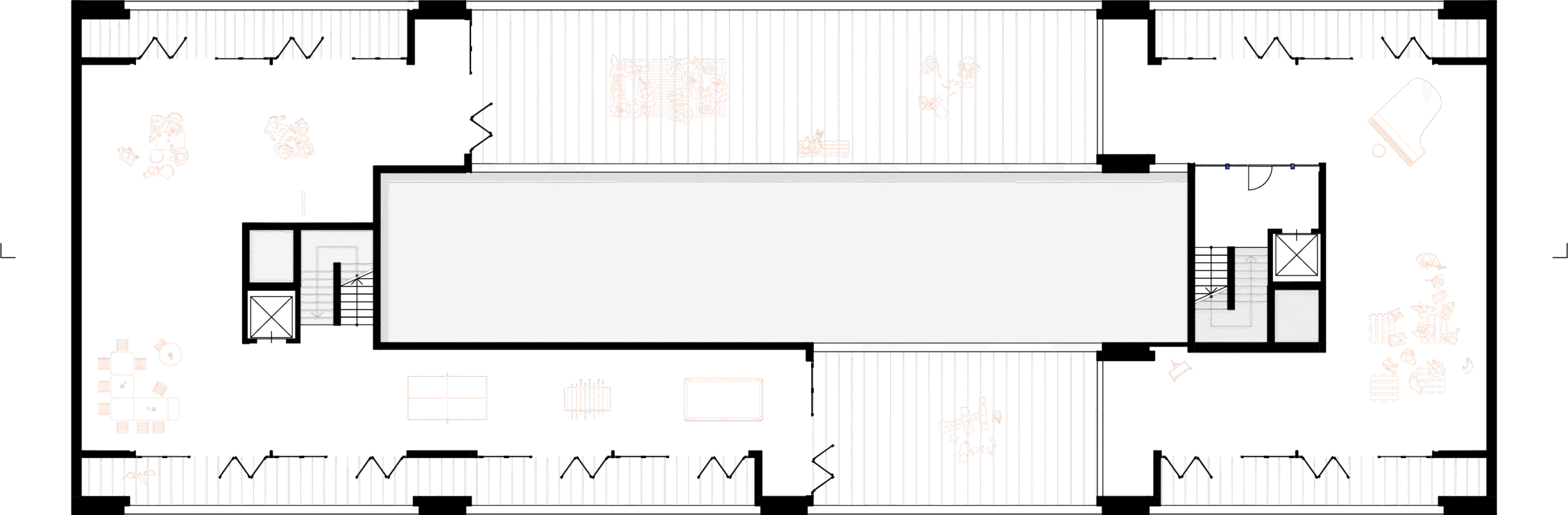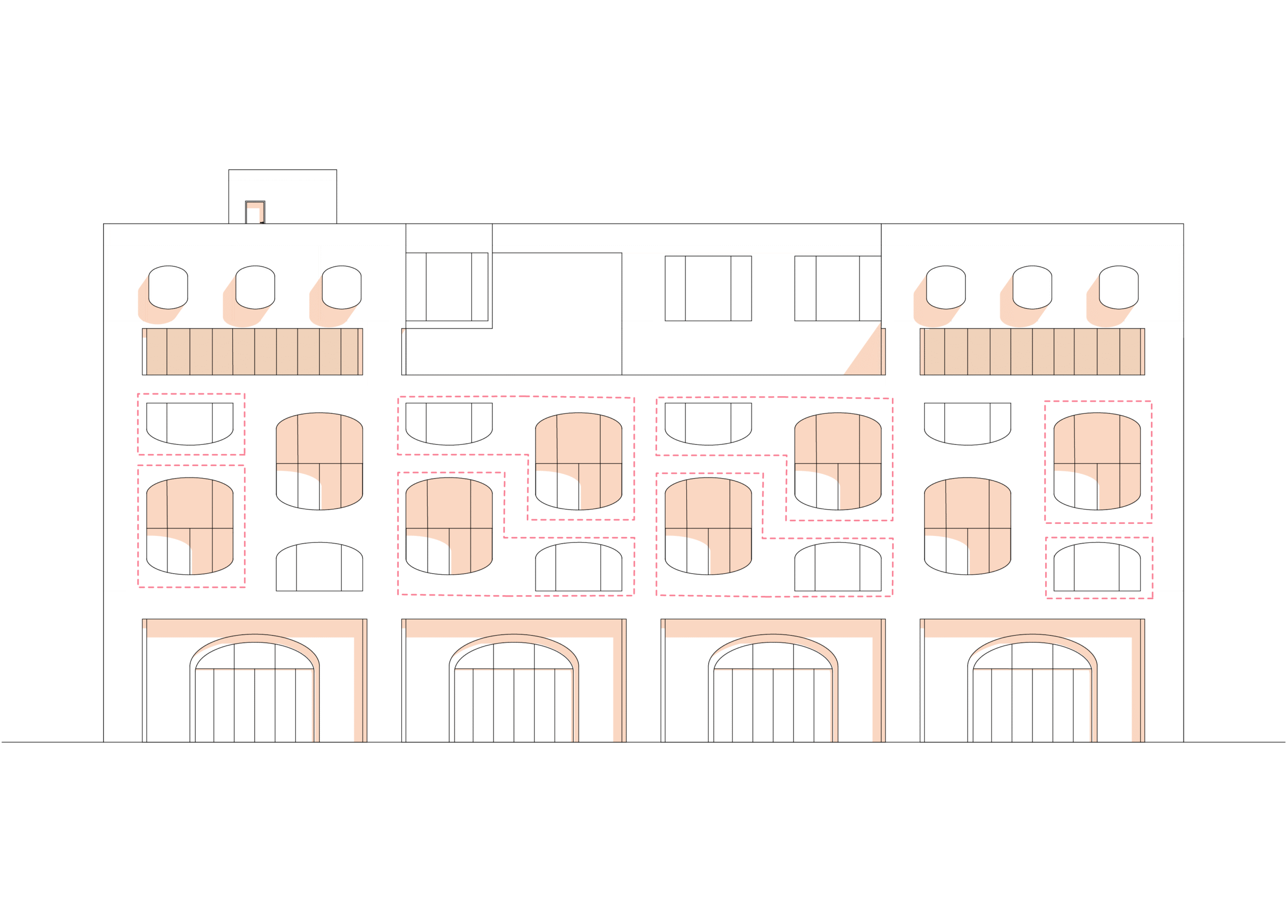 The ground floor is defined by a rigorous 2×2 meter structural grid, creating a porous market hall characterized by large arches. This open layout creates a flexible “city foyer,” inviting the public in while supporting the residential volume above.
