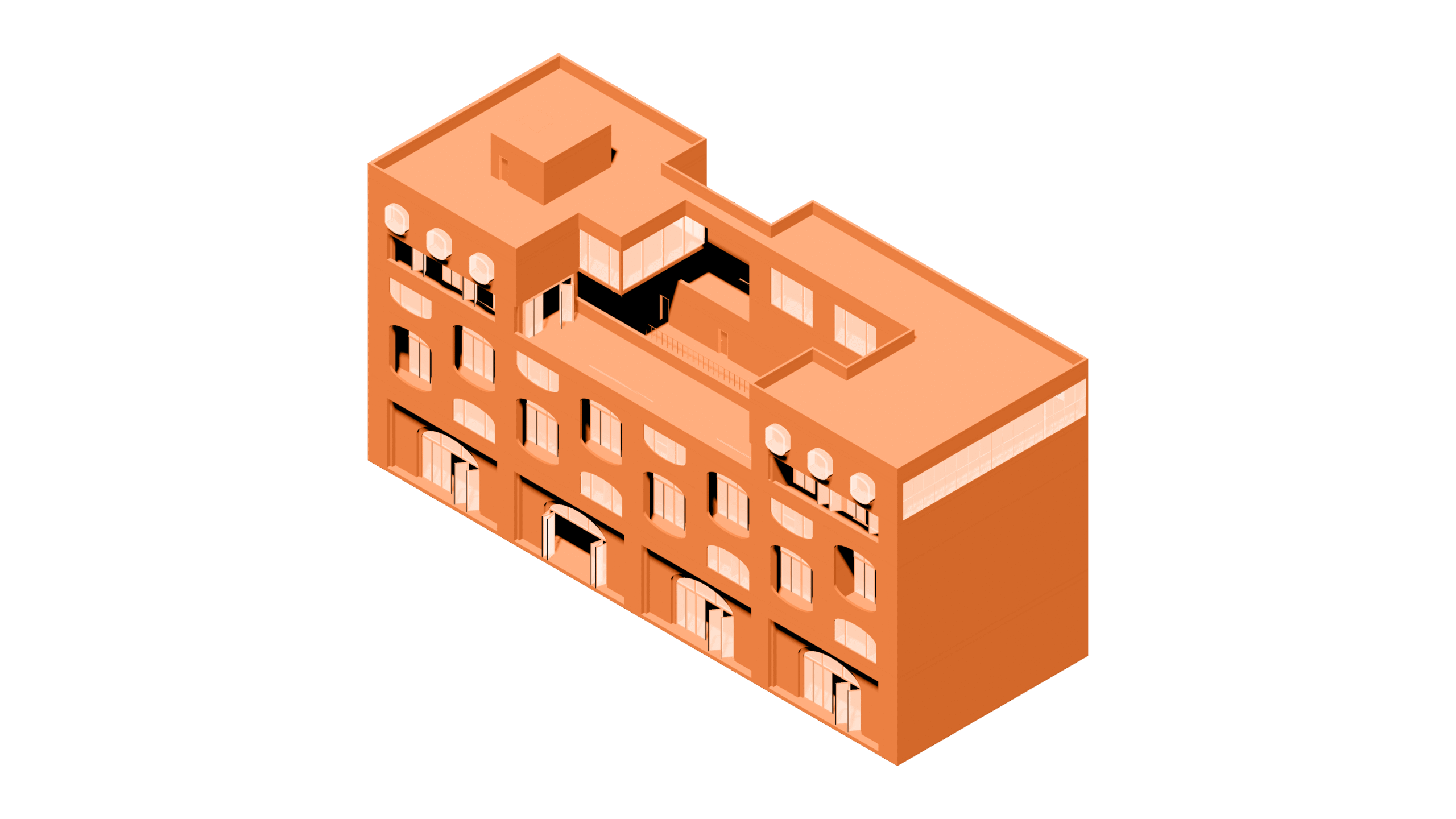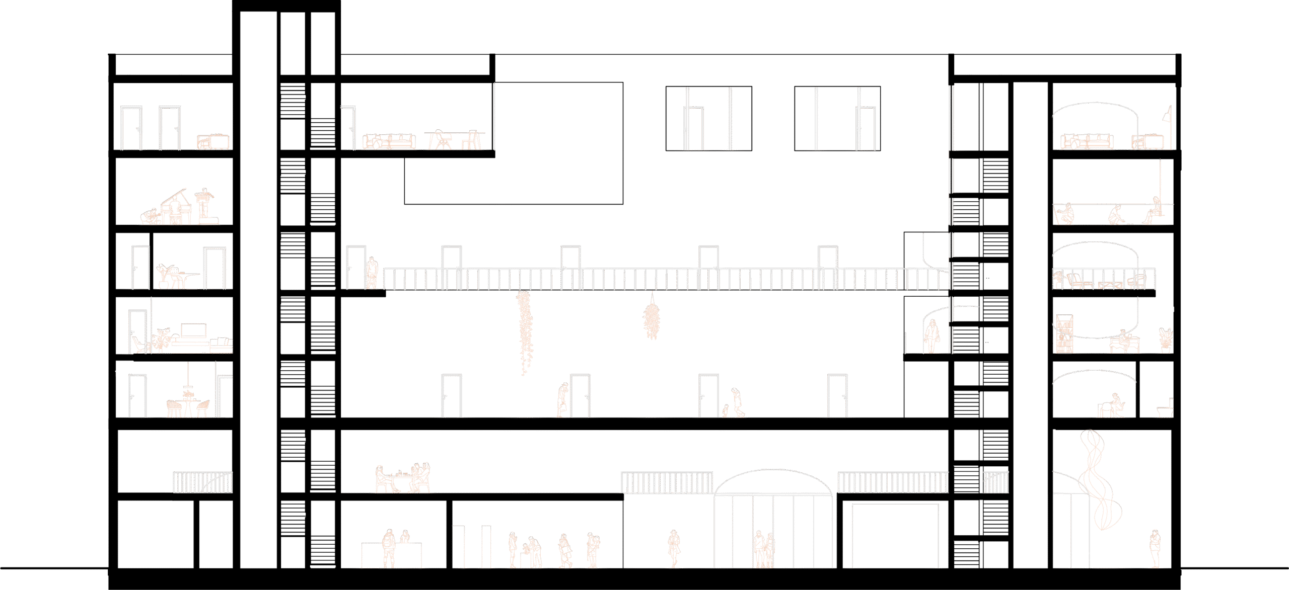 “Casa de la Comunidad” creates a vertical city fragment that bridges public life and private retreat. The design acts as a collage, stacking distinct functional layers: a vibrant public market hall at the base and a complex residential topography above.