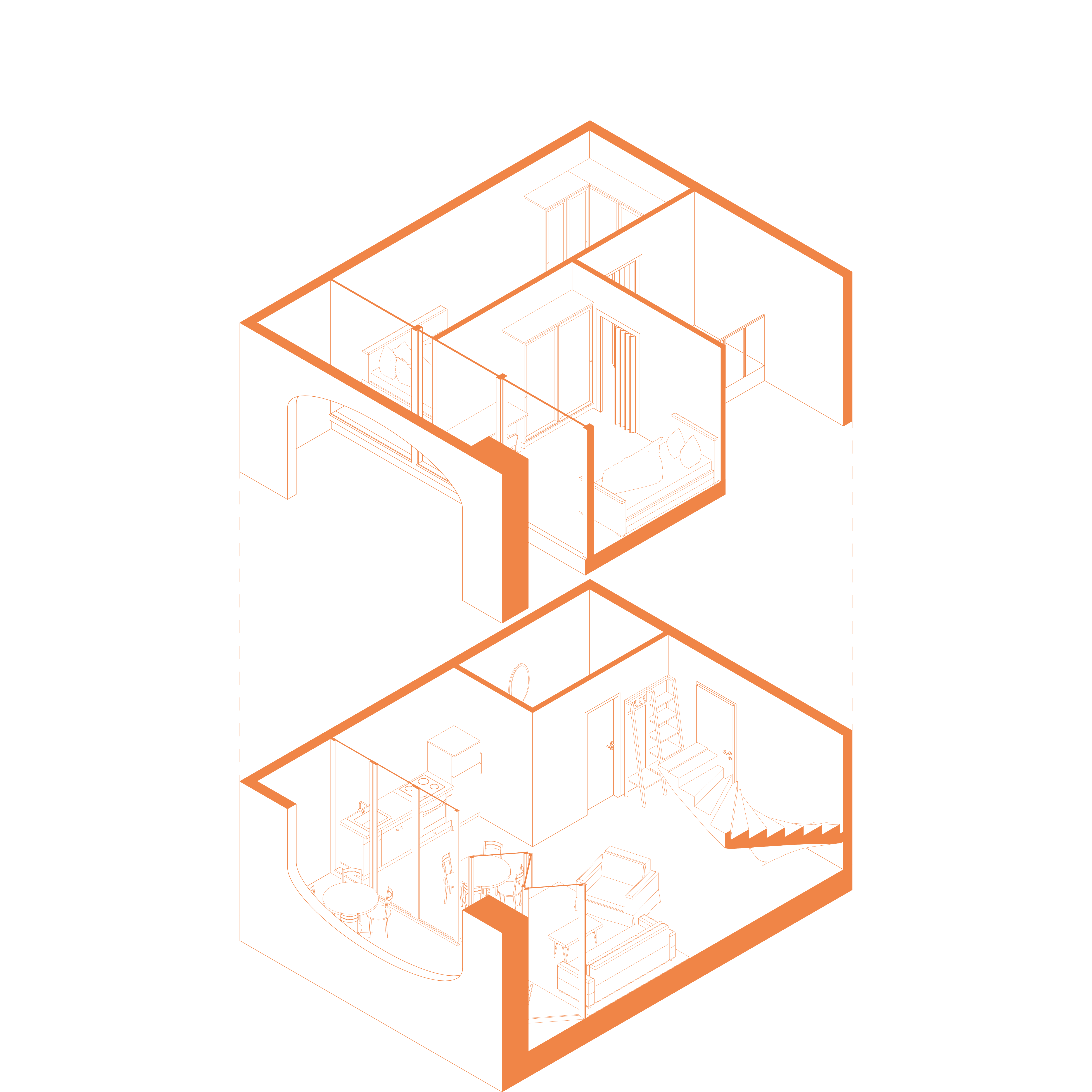 The housing levels feature an interlocking system of “L-Type” and maisonette apartments. By nesting units across split levels, the design maximizes spatial efficiency and creates diverse living configurations. The accordion facade allows residents to transform their private loggias into open terraces, dissolving the boundary between interior and exterior.